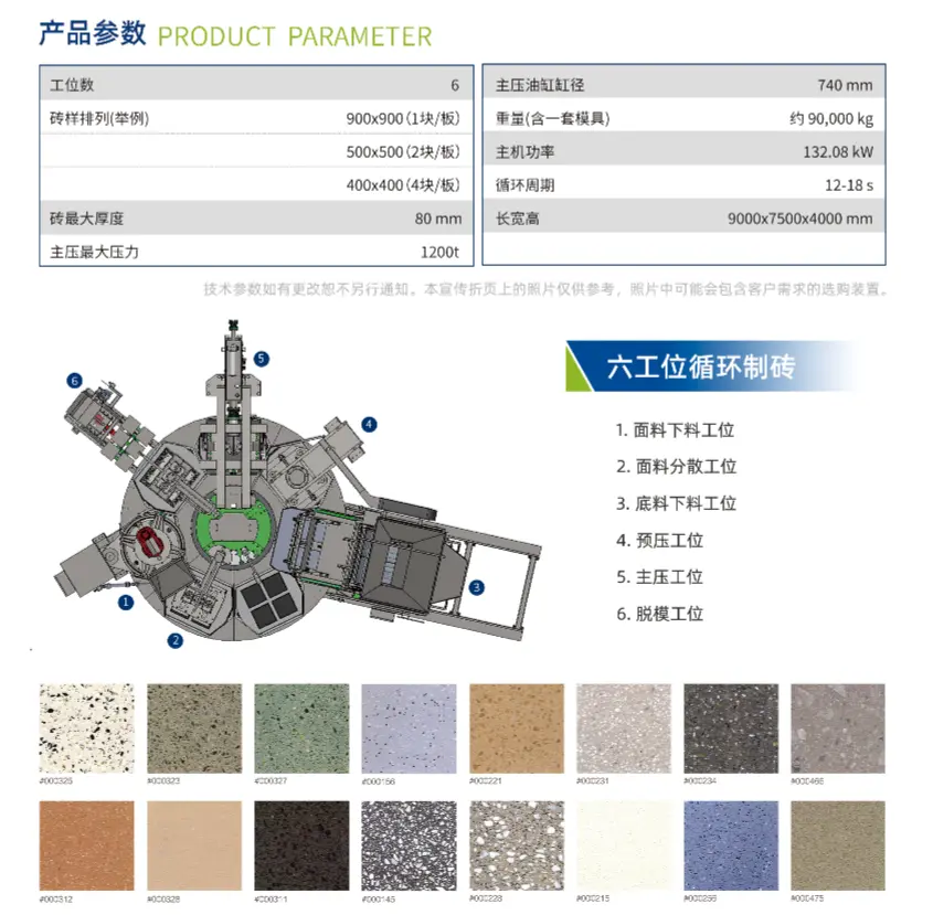 HP-1200Tロータリーテーブルスタティックプレスは、レンガ製造プロセスを創造的に7つのステーションに分割し、円形レイアウトに配置して床面積を削減し、広い成形面積と成形高さの範囲を備えており、模造石コンクリートブロック製品に対する顧客の多様な要件を確実に満たし、国内のロータリー7ステーション模造石レンガ機械のギャップを埋めます。同社が策定したグループ標準「T/CCMA 0125-2022 ロータリーマルチステーション静的プレスコンクリートブロック成形機」は、2023年工業情報化部の100グループ標準適用実証プロジェクトの1つに選ばれた。